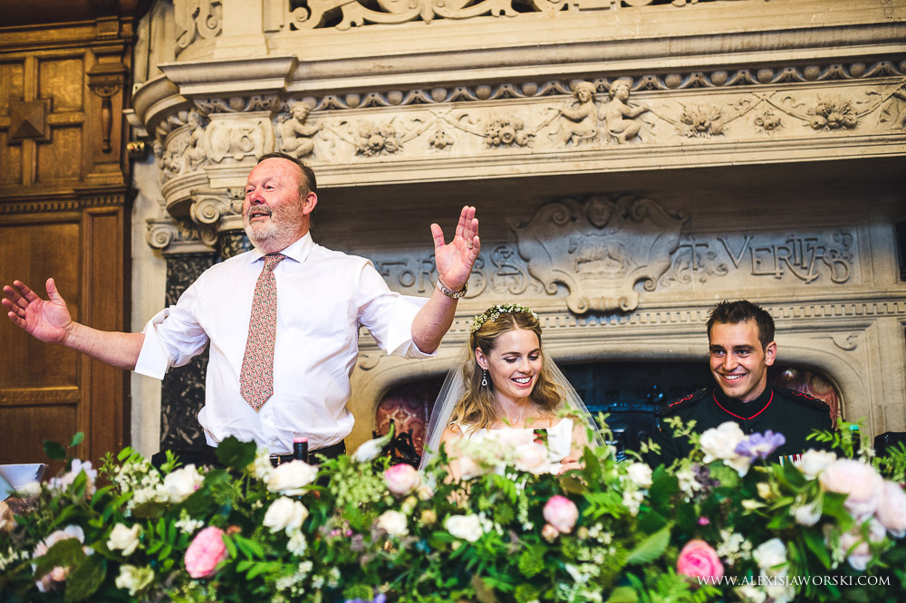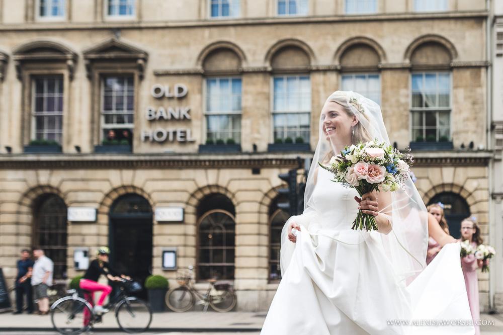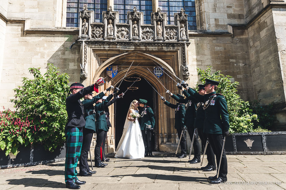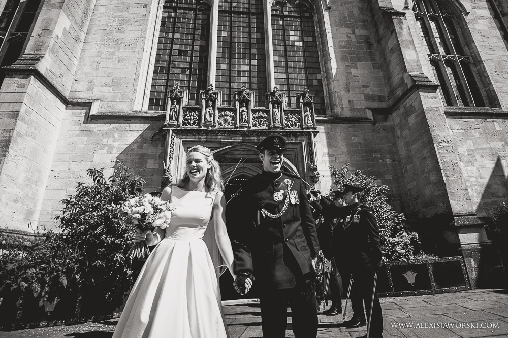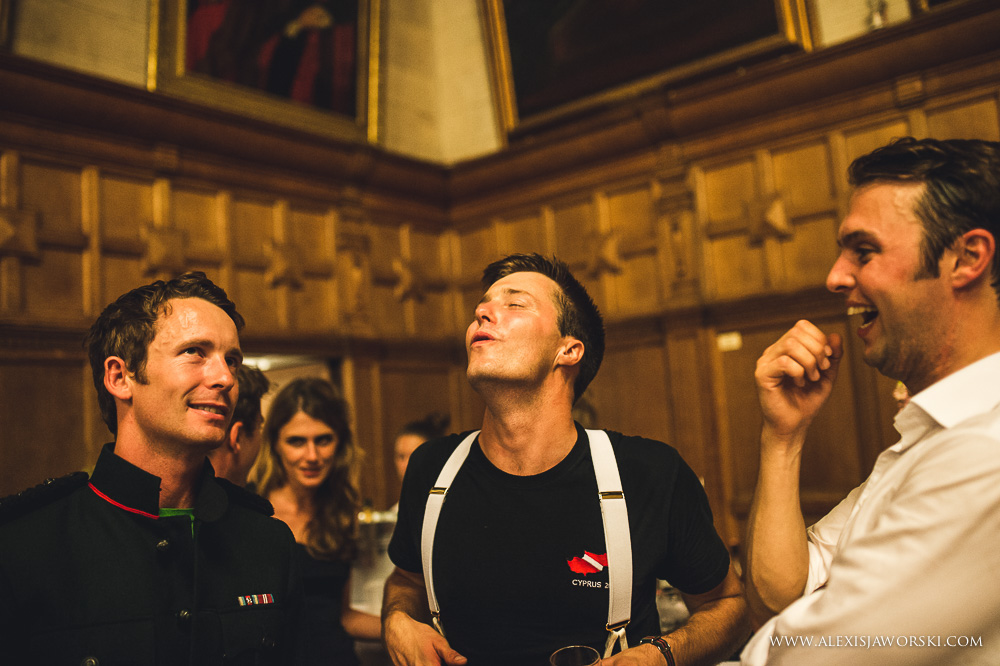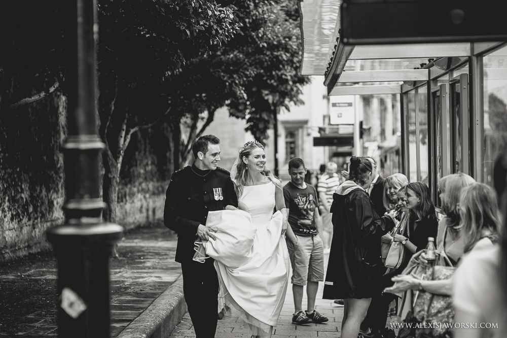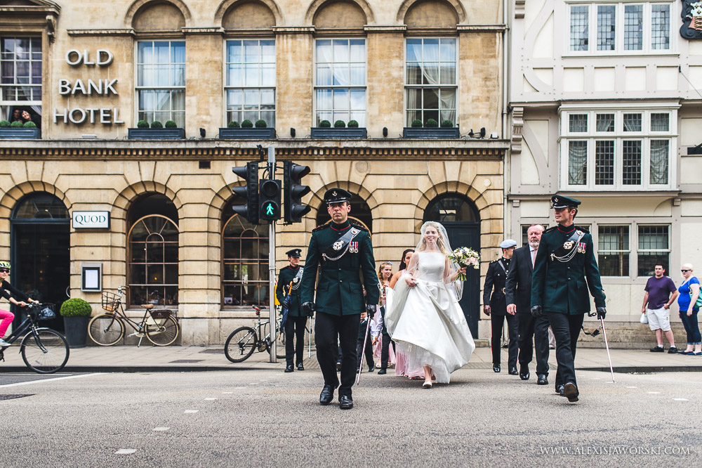 My day started at the Old Bank Hotel for bridal preparations before walking to the church in busy Oxford. Beulah and her bridal party where escorted by a few members of the guard of honour. It was beautiful to see people looking and moving aside to let Beulah walk to Magdalen College. The chapel is incredibly beautiful. It was a bit of a shame that I could only photograph from very far back (and high) and had to almost fight with the verger to get the last shots at the end of the service despite the priest agreeing for me to capture those last moments from below. Every church has different rules. Nevertheless, I was still able to capture some nice images and it was beautiful to see Beulah and Luke exiting the chapel through a guard of honour – another of many WOW moments of the day. We then went for the drinks reception in the gardens of the college, before walking through a park in Oxford and reaching the Town Hall, the venue for the wedding breakfast and evening party.